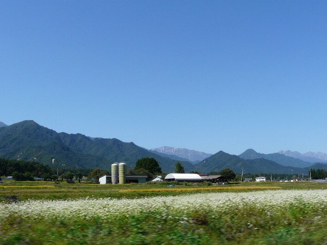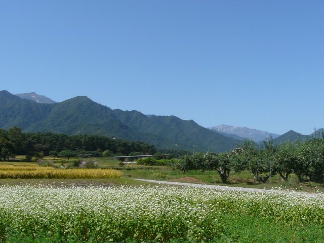 「そば畑と田園風景と餓鬼岳・仁科三山」(松川村神戸にて)