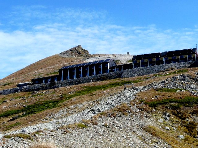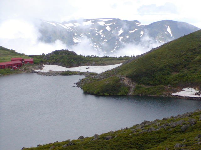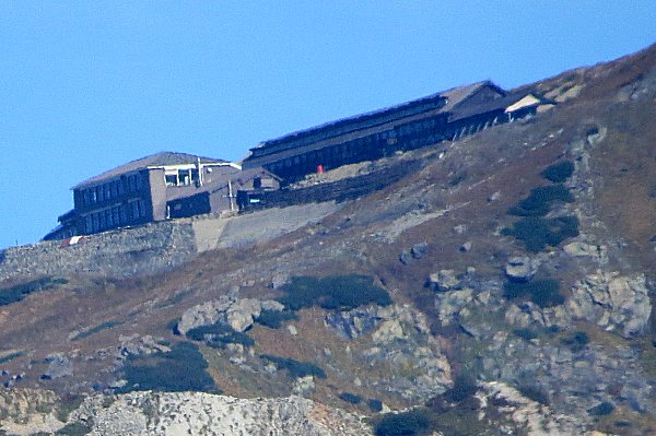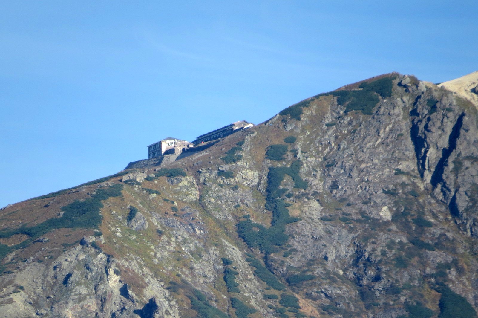 「初冠雪の白馬岳山頂と白馬山荘」(白馬にて)