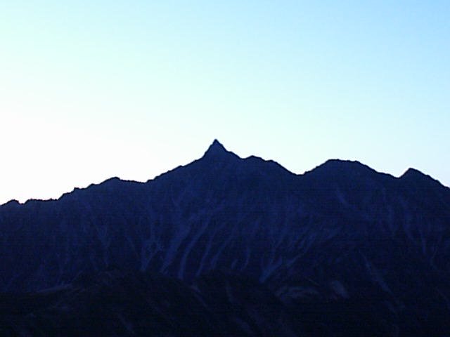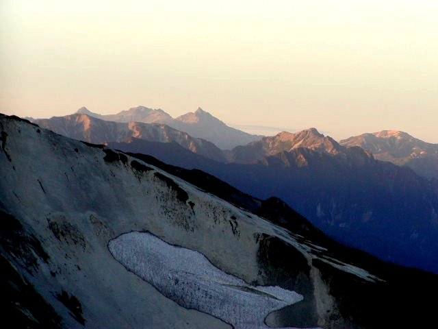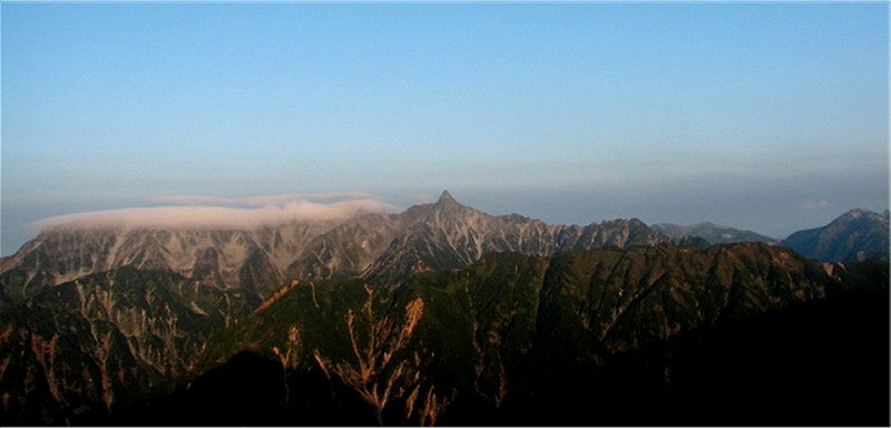 「朝の槍ヶ岳・穂高連峰」(南岳・大キレット・北穂・涸沢岳・奥穂・ジャンダルム・天狗の頭・間ノ岳・赤岩岳・西穂)(笠ヶ岳テント場にて)