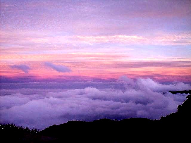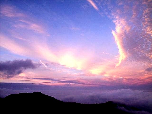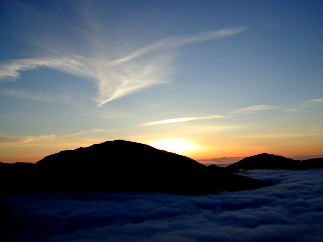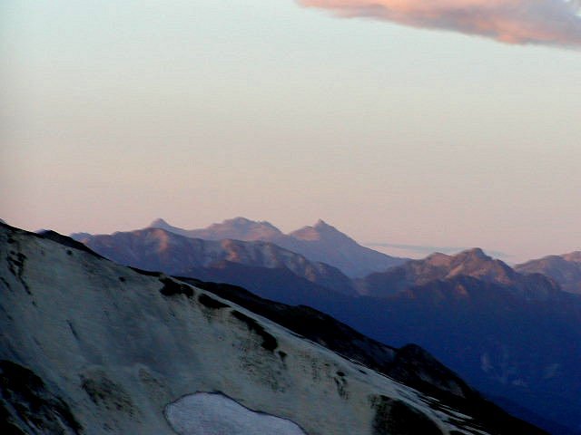「朝焼けの富士山と南ア」「朝焼けの八ヶ岳」(燕岳にて)