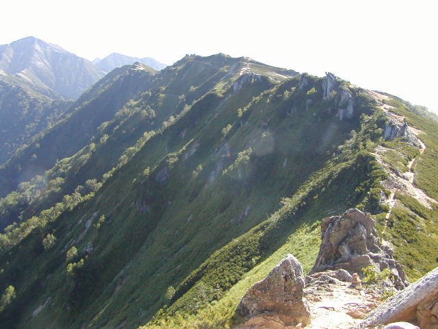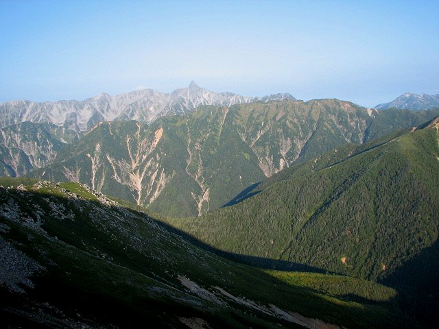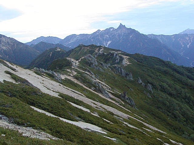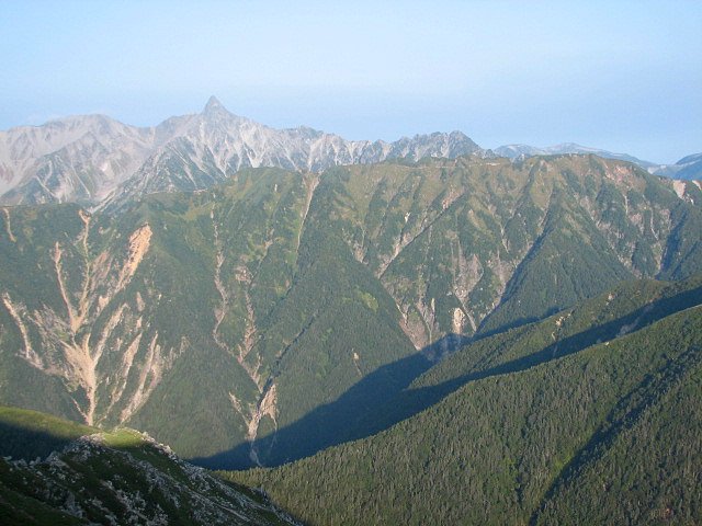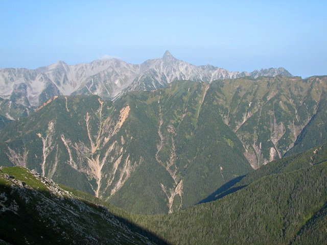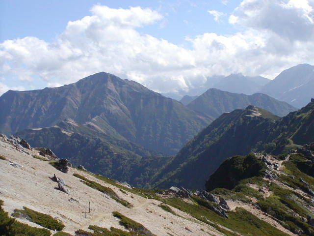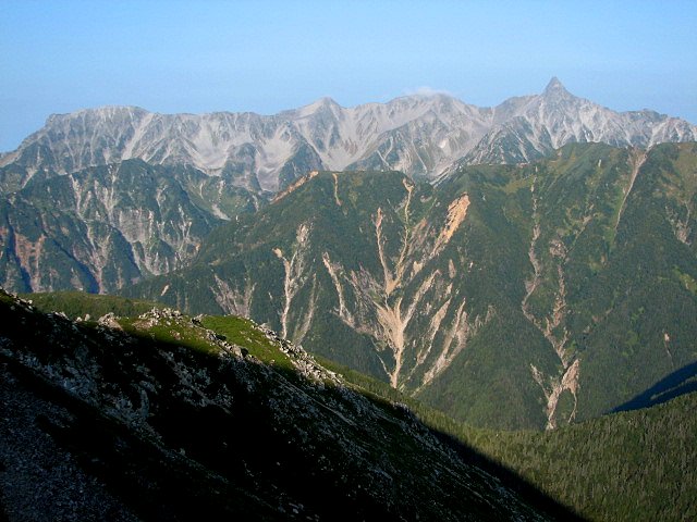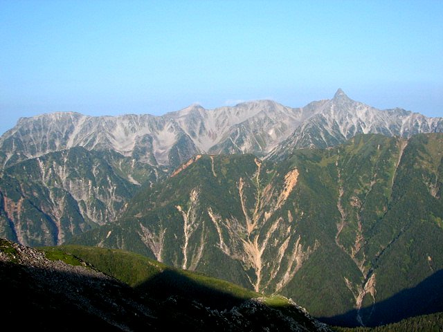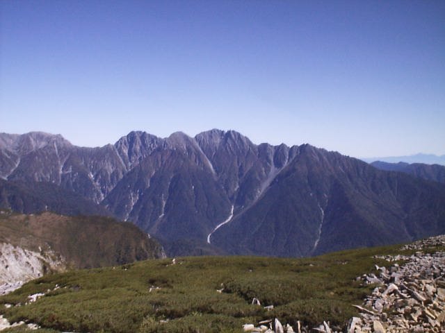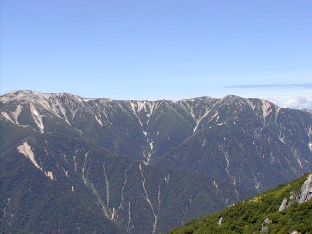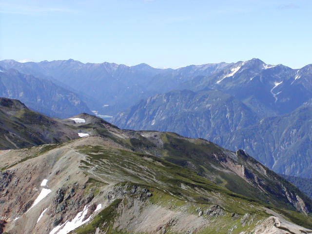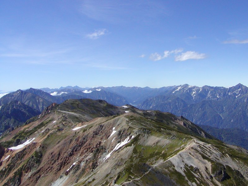 手前は赤沢山・西岳・喜作新道・赤石岳の稜線」(常念岳にて)