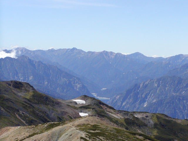 手前は蓮華岳・針ノ木峠・針ノ木岳、岩小屋沢岳の稜線、牛首尾根、手前は白馬鑓ヶ岳」(白馬岳山頂にて)