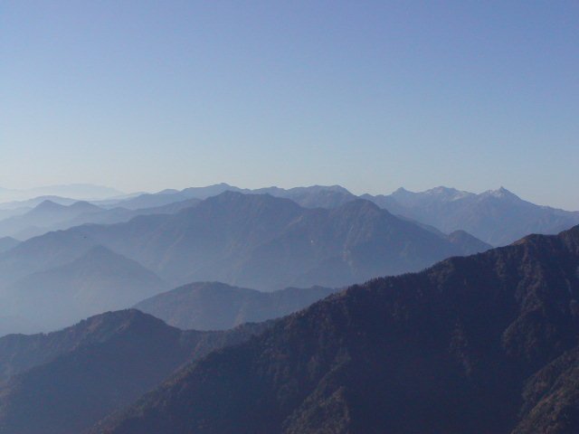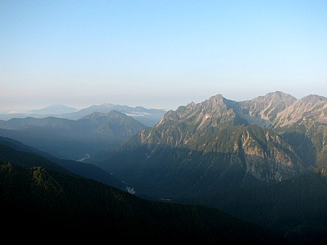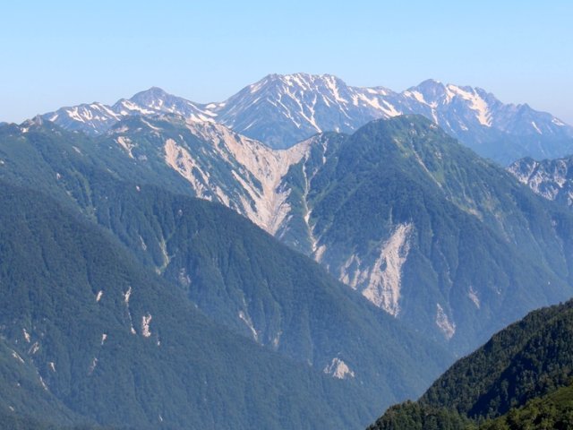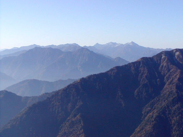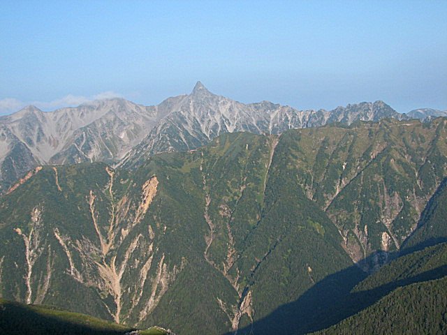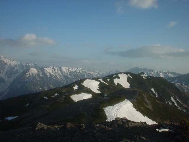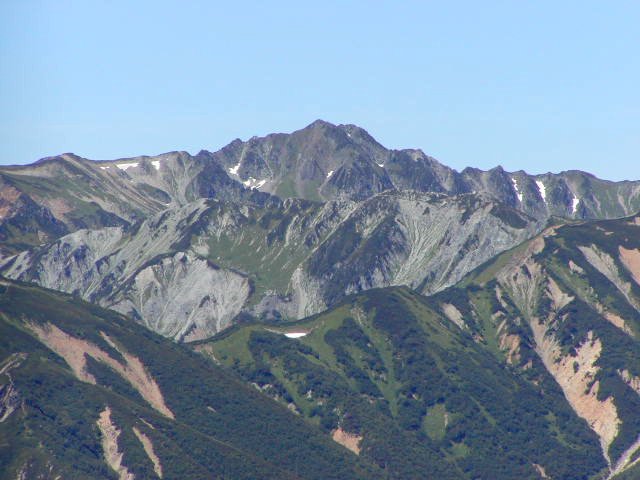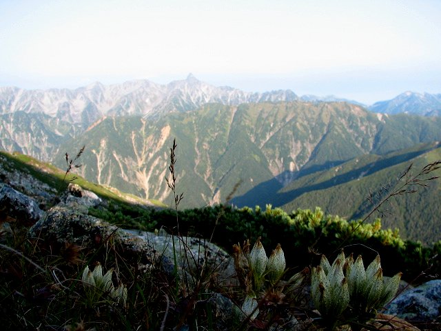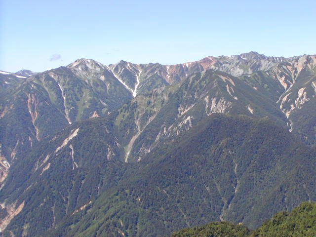 手前に赤沢山・西岳・赤石岳の稜線」(常念岳にて)