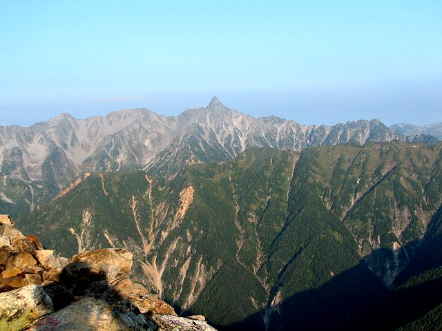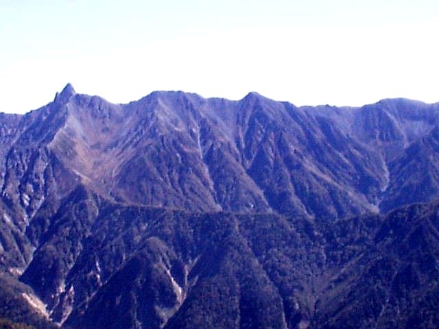 奥に牛首・赤岩岳・西岳・前穂・奥穂・南岳・中岳・槍ヶ岳」(爺ヶ岳にて)