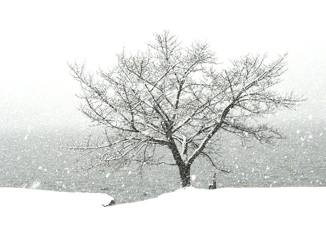 「雪降る青木湖の桜」(大町・青木湖にて)
