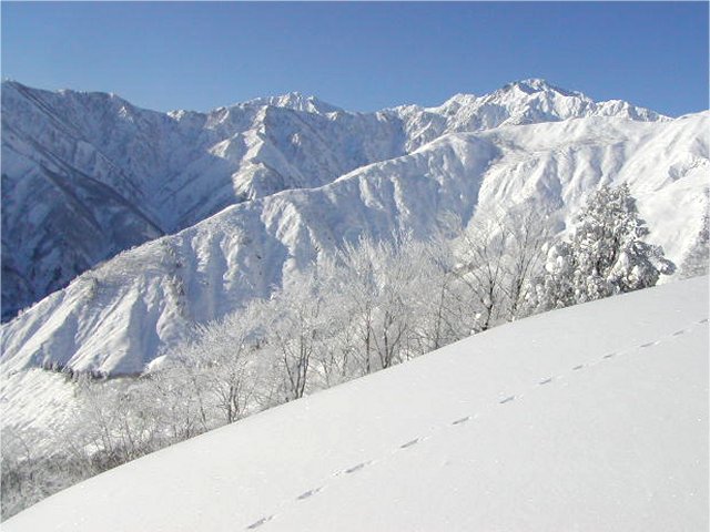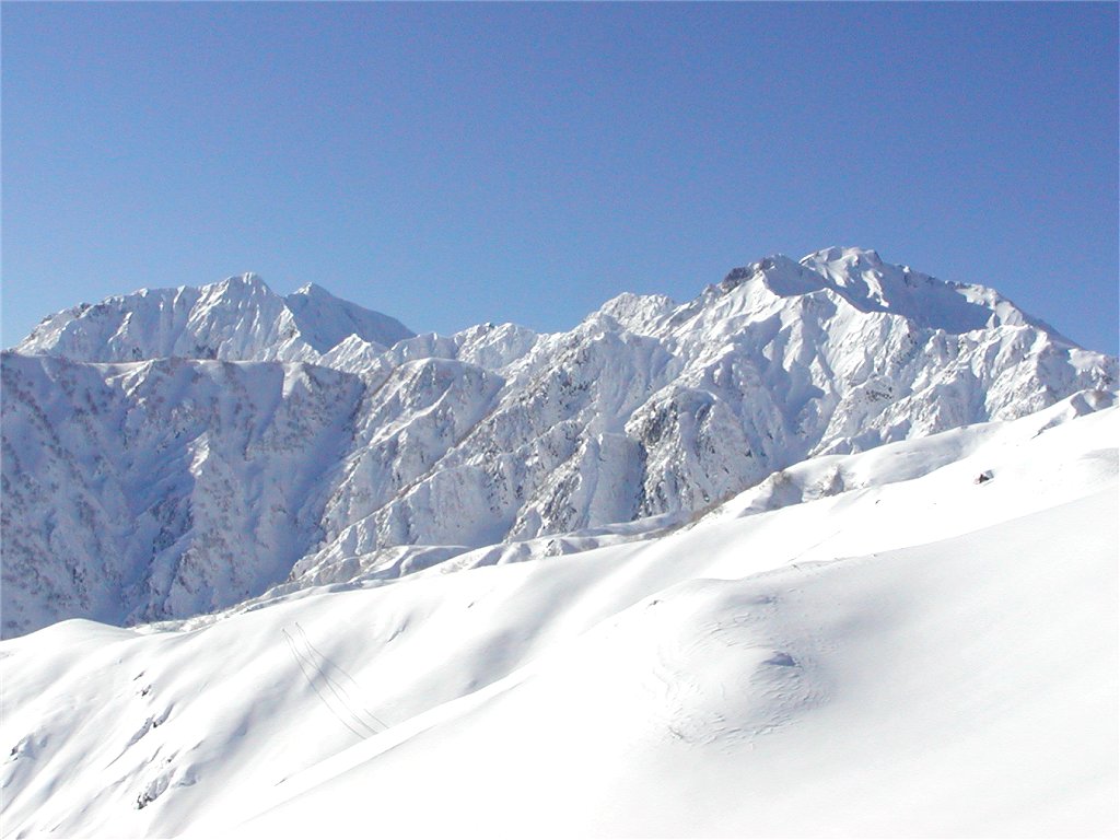 「冠雪の鹿島槍ヶ岳〜八峰キレット・五龍岳」(鹿島槍スキー場にて)