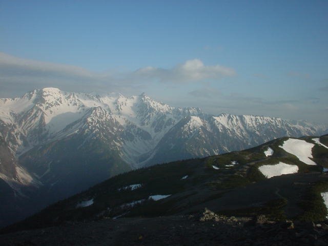 「朝日差す残雪の槍・穂高連峰」(春の蝶ヶ岳にて)