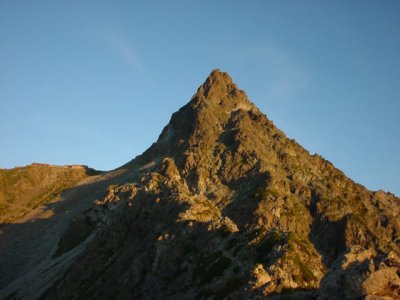 「朝日差す奥穂・ジャンダルム・槍ヶ岳