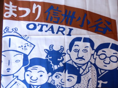 ■「塩の道まつり」では大町・白馬・小谷の観光連絡会が北アの山並みや名所・旧跡、草花、たりたり、村男、おおまぴょんのキャラなどをプリントした「手拭い」が参加証で貰えた。 懐かしい。