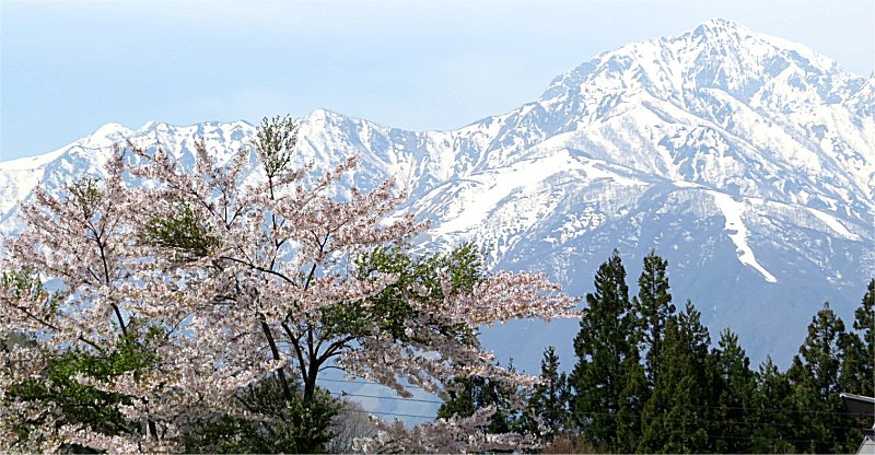 「桜と爺ヶ岳・鹿島槍ヶ岳」(白馬青鬼にて)